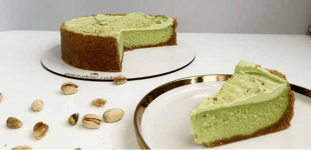 Фісташковий чізкейк – це вишуканий десерт, що поєднує в собі ніжний кремовий сир і насичений смак фісташок. Його основа виготовлена з хрусткого печива, яке доповнює гладку текстуру начинки.